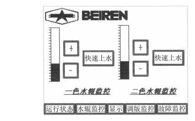 在人機界面中,設計了7幅畫面,包括整體圖形,故障顯示,機器速度和計數顯示,水輥速度顯示,調版監控等。故障顯示使用指示器,給出位元件即可實現閃動效果,讓操作者很方便的知道故障部位,整體感很好。在水輥速度顯示中,設計了一個柱狀圖,可以顯示水量增加大小,只需按下柱狀圖,就可增加水量,同時也可方便監控。如圖所示: