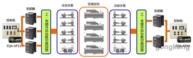 即冷凍水側(cè)可以啟動任意三臺水泵變頻節(jié)能運行,冷卻水側(cè)可以啟動任意兩臺水泵變頻節(jié)能運行。同時,變頻運行和工頻運行模式可以自由地進行切換,滿足不同的管理需求。