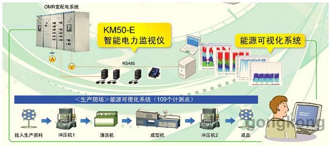 為了對工廠的生產(chǎn)和動力用電進行更好地監(jiān)視,以便于管理用電以達到有效用電和節(jié)能的目的,我們在新OMR工廠對生產(chǎn)和動力用電共計109個計測點安裝了智能電力監(jiān)視儀KM50-E.