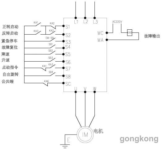 功能端子SC/S8可實現(xiàn)自由停車,SC/S4可實現(xiàn)報警復位,SC/S3可實現(xiàn)緊急停止,可根據(jù)需要選用。
