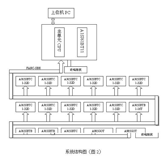 整個系統采用了三菱A系列的PLC和GOT人機界面以及16個遠程I/O模快組成。系統圖如圖2所示。