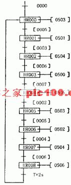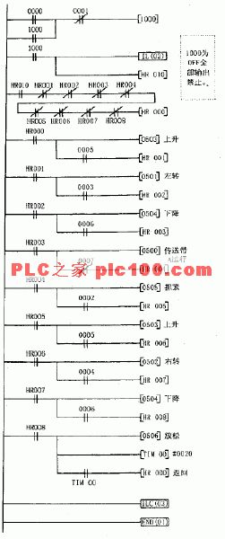 ,其作用是:當機械手工作在某一中間工步時,若 PLC斷電或停止運行,機械手停止在中間工步上。PLC復電或重新投入運行后,由于保持繼電器HR具有狀態斷電保護的功能,因此在重新起動時,中有某一個是斷開的,使得HR000不能置位,機械手只能從停止前被置位的保持繼電器的后續工步繼續動作。