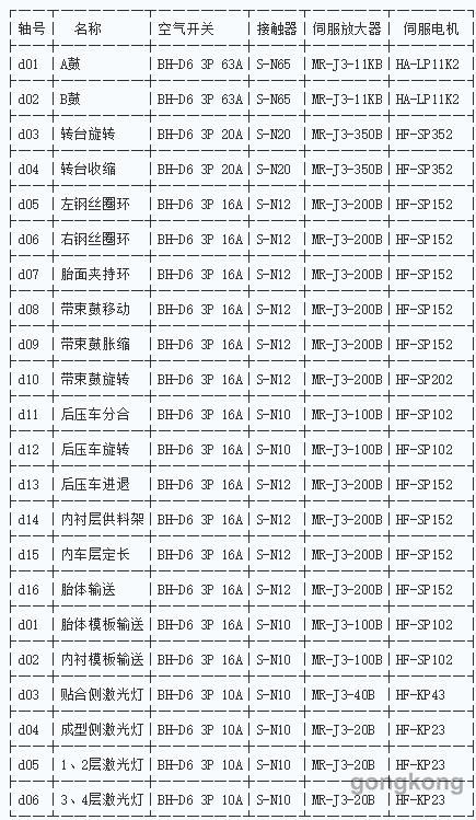 輪胎行業的發展非常的迅速,自動化水平越來越高,尤其是現在這個知識社會,產品更新特別的快,就拿三菱的伺服來說吧,這幾年先后出現了MR-E系列,J2系列,MR-J3系列,現在又出現了J4和JE,每一個產品的更新換代,都是社會的進步,知識的進步,都標志著工業自動化水平進入了一個更高的水平。新產品的出現在性能上,包括處理的時間、運行的速度、人性化、穩定性和壽命等各方面都是更優越的。評價一個輪胎成型設備的關鍵因素就是設備的生產效率,所以在控制時候,需要的處理速度和穩定性上是非常關鍵的,以下是系統22個軸的選型配置: