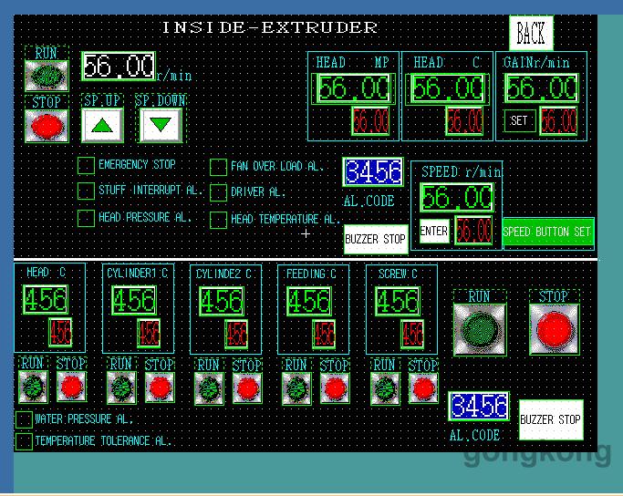 FR-E740-90K-CHT有編碼器反饋,精確控制電機的速度,實現閉環(huán)控制電機轉速,只要有故障動作就停止工作,同時GT1045-QSBD人機界面跳轉到故障顯示畫面,在畫面上可以看到擠出機的相應部位的故障原因,故障部分有詳細的文字說明。人機界面為用戶提供4組畫面,分別為“開機介紹”、“參數設定”、“手動調整”、“運行狀態(tài)”。