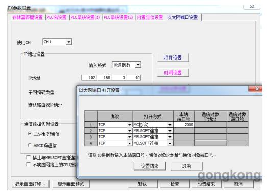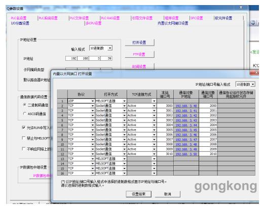 1,由于有 10 臺 FX3GE 與 Q CPU 通訊,如果 10 臺通訊同時調試加大了難度,所以可以先調試一臺 FX3GE 與 Q CPU 的通訊,首先設置Q 和FX 的通訊參數,主要參數為使用通訊通道、IP 地址、通訊協議、打開方式、端口號、通訊數據代碼設置等。 FX3GE 參數設置如圖二。