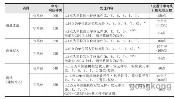 3,根據FX3GE 內置以太網MC 協議命令編寫相應的程序,MC協議讀寫軟元件時的主要命令和最大處理點數如圖四。
