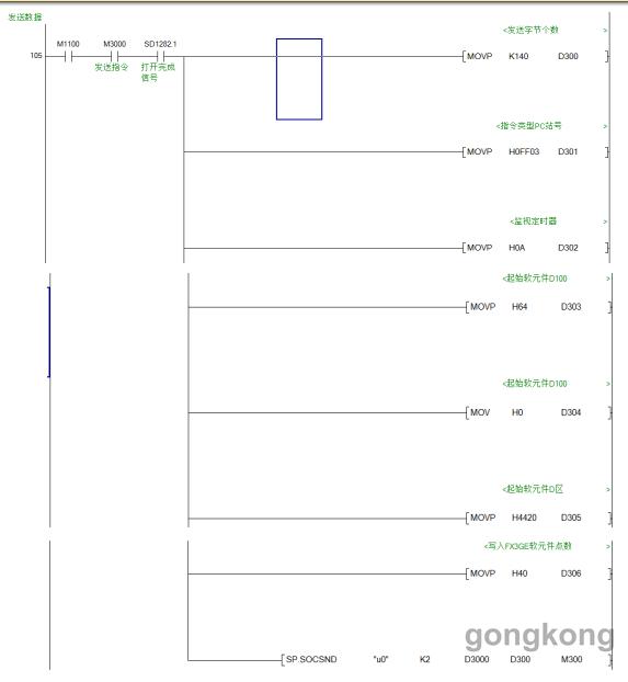 4,根據FX3GE 內置以太網MC 協議的命令格式在Q CPU內進行編程,首先用Q 內置以太網的打開/關閉命令(SP.SOCOPEN/ SP.SOCCLOSE)對各個通道進行打開和關閉處理,然后再編寫進行發送數據和接收數據處理的程序,有關Q CPU程序要向FX3GE發送的 MC命令格式的主要程序如圖七。