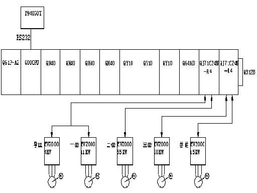 如圖,系統采用三菱公司的Q系列PLC作為主控制器,傳動控制為艾默生公司的EV2000系列變頻器,人機界面為F940GOT。