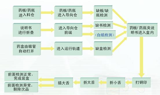 自動裝盒機(jī)進(jìn)料一般分為三個(gè)入口:說明書入口、藥瓶/藥板入口和機(jī)包盒入口。從機(jī)包盒進(jìn)料到最后包裝成型的整個(gè)過程大致可以分成四個(gè)階段:下盒、打開、裝填、合蓋。下盒動作通常是由一個(gè)吸盤從紙盒進(jìn)料口吸取一個(gè)紙盒,下行到裝盒的主線上,由一個(gè)導(dǎo)軌卡位將紙盒固定并用一個(gè)推板打開紙盒,同時(shí)會有兩個(gè)可向前移動的卡位從下面升起,從前后方向卡住紙盒的側(cè)面,使盒子打開成直角并前移到裝填區(qū)域。在裝填區(qū)域填裝后,機(jī)器的機(jī)構(gòu)會將耳朵折進(jìn)左右的導(dǎo)軌中,然后再進(jìn)行合蓋動作。