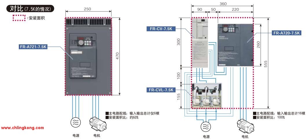 能夠使設備尺寸得到縮減(與FR-A700系列相比,減小設備體積)。