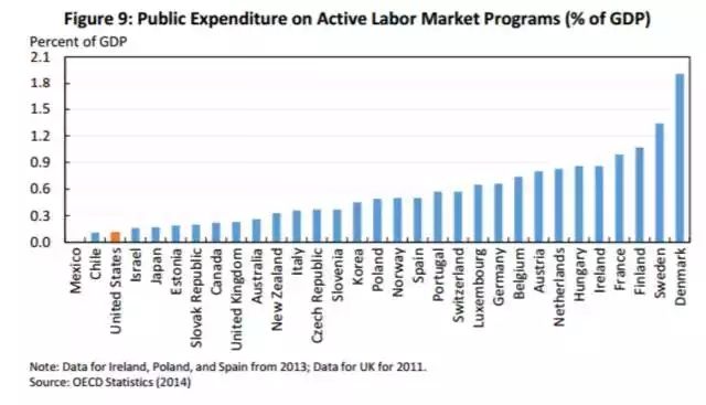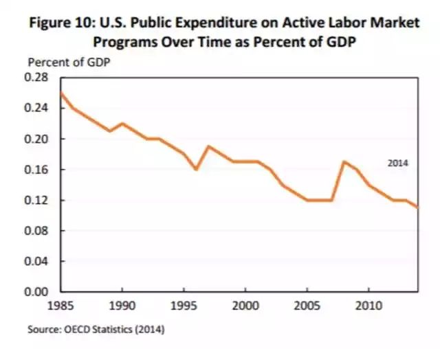 如果說科學技術讓任務自動化及其所帶來的其他改變不能夠解釋上圖中美國和其他國家不平等和勞動力參與率的區(qū)別,那么我們就要考慮到調節(jié)這些變化的政策和制度。例如,其他的國家傾向于將更多的資源投入到主動勞動力市場方案(active labor market programs)當中,幫助勞動者進行工作轉型,例如培訓項目或是求職協(xié)助等。經(jīng)濟合作與發(fā)展組織(OECD)的成員國,除美國外,在 2014 年平均在主動勞動力市場方案上的花費占到了 GDP 的 0.6%,而美國在這一方面的花費只占到了 GDP 的 0.1%(如圖 9)。另外,美國目前在主動勞動力市場方案的花費占 GDP 的比重不到 30 年前的一半。