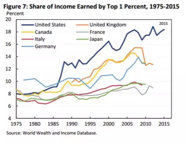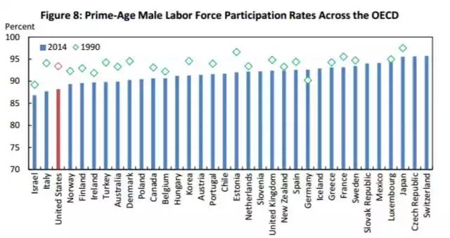 在過去的 40 年當中,其他主要的發(fā)達國家已經(jīng)發(fā)生了和美國類似的技術變化,但是美國的收入不平等和整體的不平等水平均大幅上升,如圖 7 所示。其他一些發(fā)達國家的男性壯年勞動力參與率明顯下降,而美國的下降水平在所有的發(fā)達國家當中最為嚴峻,如圖 8 所示。