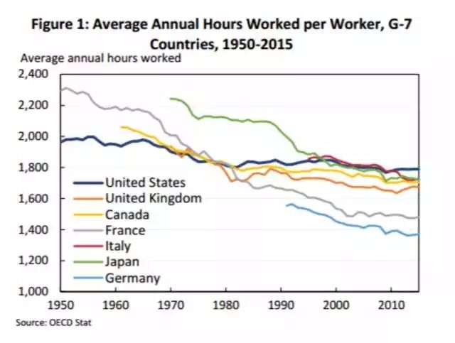 技術提升生產率的一個主要方式是減少單位產出所需要的勞動力。勞動力生產率的提升一般會轉移到平均薪資的增加上,給工人帶來更多減少工作時間的機會,同時讓他們能負擔起更多的消費品和服務。生活標準和休閑時間也都會增加,然而不平等程度也在上升,最近幾十年,這種不平等甚至抵消了那些增長。期望生產率提高會伴隨工資增長讓約翰·凱恩斯在其上世紀三十年代寫了一篇題為《我們孫子輩的經(jīng)濟可能性(Economic Possibilities for our Grandchildren)》的文章,文中考慮了技術進步率,預測我們現(xiàn)在或許已經(jīng)實現(xiàn)了一周工作 15 小時。雖然這個預測還遠沒有實現(xiàn),但在過去的 65 年里,大多數(shù)發(fā)達國家見證了每年的工作時間都在大幅下降(圖 1)。然而唯獨在美國,這個下降卻在上世紀 70 年代停止了,自那時起工人的平均工作時長一直保持到現(xiàn)在。