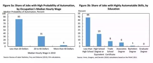 除了了解總體就業(yè)影響的大小之外,理解分布影響也很重要。CEA 根據(jù)工資對職業(yè)進行排名,他們發(fā)現(xiàn)根據(jù) Frey 和 Osbourne 的分析,相比每小時工資在 40 美元以上只有 4% 和 20 美元到 40 美元之間只有 31%工作受到影響,每小時工資低于 20 美元卻高達 83%工作將受到自動化的壓力(圖 3a)。此外,OECD 研究估計,受教育程度較低的工人比受過高等教育的工人更可能被自動化取代(圖 3b)。事實上,OECD 研究的作者估計,44%的低于高中學歷的美國工作者的工作很可能會被自動化,而只有 1%本科或更高學歷的人擁有這樣的工作。在一定程度上教育和工資與技能相關,這意味著對低級技術的需求大幅下降,對高技能工人的需求幾乎沒有下降。這些估計表明短期內的科技更迭技能偏見將持續(xù)存在。