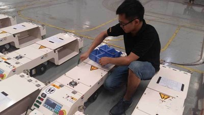 工人在調(diào)試自動(dòng)導(dǎo)引運(yùn)輸車(AGV)