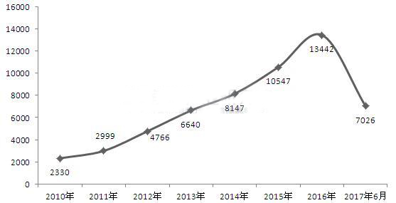 圖表2:2010-2017年伺服電機行業相關專利公開數量變化圖(單位:項)