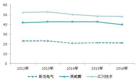 從我國伺服電機行業上市公司產品的毛利率來看,英威騰與匯川技術兩家企業低壓變頻器與伺服類產品的毛利率保持在40%以上的高水平,臥龍電氣的電機及控制裝置產品的毛利率也保持在20%以上。伺服電機行業整體毛利率水平處于較高水平,企業伺服類產品盈利能力較強。